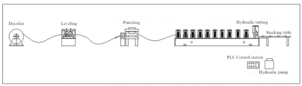 Manual decoiler→Feeding material into punching machine →Roll forming machine →Measure length →Hydraulic cutting →Finished Products